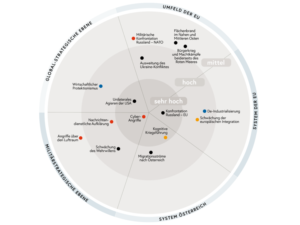 Eine Gefahr sieht das Risikobild ebenso in den Konflikten im Nahen und Mittleren Osten sowie in Afrika. So müsse sich Europa auf „zunehmende Migrationsströme im Bereich der irregulären Migration einstellen“, sagte der Generalmajor. Migration zu „triggern“, sei Teil der hybriden Kriegsführung. Manipulationen und ähnliche Maßnahmen mit dem Ziel, Vertrauen in die eigene Regierung zu schwächen, würden zunehmen. Cyberangriffe, unter denen Österreich bereits „immanent“ stehe, seien ein weiteres Risiko, wenngleich die Behörden derzeit noch in der Lage seien, diese abzuwehren.