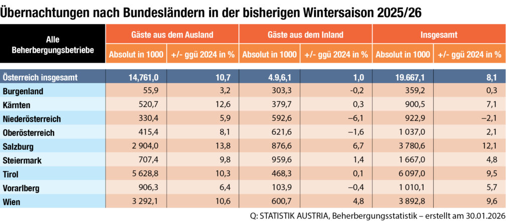 Die bisherige Wintersaison 2025/26 (November und Dezember) fällt bislang klar positiv aus: In den ersten beiden Monaten der laufenden Wintersaison gab es österreichweit insgesamt 19,67 Millionen Nächtigungen, was einem Plus von 8,1 Prozent entspricht. Am deutlichsten fällt dieses in Salzburg mit plus 12,1 Prozent im Vergleich zum Vorjahreszeitraum aus.